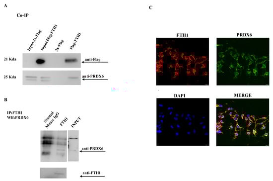 To assess PRDX6-FTH1 physical interaction, HEK-293T cells transiently transfected with 3xFlag-FTH1 or 3xFlag control vector were employed for the co-immunoprecipitation experiment. The cell lysates were incubated with the ANTI-FLAG M2 affinity gel, and the immunoprecipitated complexes were separated by SDS-PAGE and analyzed by Western blot with anti-PRDX6 and anti-Flag antibodies, respectively. As shown in Figure 2A, the interaction between the two proteins was confirmed. The same result was obtained by investigating the interaction between the endogenous proteins expressed at basal levels in wild-type HEK-293T cells (Figure 2B). Confocal microscopy analysis demonstrated the cytoplasmatic colocalization of FTH1 and PRDX6 (Figure 2C), as expected by their localization. Furthermore, to verify if the interaction between FTH1 and PRDX6 is independent by cell lines, we replicated the same experiment in non-small cell lung cancer (NSCLC) NCI-H460 cells, transiently transfected with 3xFlag-FTH1 or 3xFlag control vector. In NCI-H460 cells, as well as in HEK-293T, FTH1 interacted with PRDX6 (Figure 3A) and colocalized in the cytoplasm (Figure 3B).