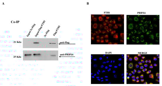Additionally, a novel partner, Peroxiredoxin 6 (PRDX6), captured our attention, being co-expressed with FTH1 in different tissue (see Table S2) and involved in several biological processes, including focal adhesion (FDR 1.35 × 10−5, cell junction (FDR 0.006), signaling by ROBO receptors (FDR 0.01) and activation of ATR in response to replication stress (FDR 0.02), as predicted by the STRING functional association analysis. (Table S3). PRDX6 is an enzyme involved in the containment of oxidative stress preventing cell peroxidation causative of membrane lesions [29]. Moreover, it has been demonstrated that its catalytic activity favors cancer cell proliferation, motility promoting invasion and metastasis processes [30,31]. In light of these important roles in promoting pathological states, the interaction between FTH1 and PRDX6 was further investigated.