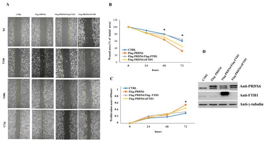 Accumulated evidence suggests that PRDX6 exerts specific functions in cancer progression, affecting cell growth, survival, migration, differentiation, invasiveness, and metastasis. In NSCLC, PRDX6 over-expression promotes cancer cell proliferation and invasive phenotype [30]. To investigate whether the interaction between FTH1 and PRDX6 might affect cell migration and proliferation, NCI-H460 cells were transiently transfected with 3xFlag-PRDX6, 3xFlag-PRDX6/3xFlag-FTH1, 3xFlag-PRDX6/siFTH1 or 3xFlag control vector. The confluent NCI-H460 cells were scraped to create a wound, and cell migration was assessed 24, 48 and 72 h later. The results of a triplicate set of independent assays (A and B of Figure 6) demonstrate that at 72 h after the scratch, the wound area of 3xFlag-PRDX6 cells was significantly narrower than that of the control. Interestingly, when FTH1 and PRDX6 were contemporaneously overexpressed, the wound area was significantly larger than in the presence of PRDX6 alone. Conversely, silencing of FTH1 induced by siRNA transfection and PRDX6 overexpression significantly increased the migratory ability compared to PRDX6 and FTH1 overexpressed cells. Next, we compared the proliferation ability of NCI-H460 FTH1/PRDX6 vs. NCI-H460 PRDX6 and vs. NCI-H460 siFTH1/PRDX6 cells. The results of the MTT test, reported in Figure 6C, showed that, at 72 h, the simultaneous overexpression of FTH1 and PRDX6 was able to significantly reduce cell proliferation with respect to the PRDX6 overexpression, the FTH1 knockdown and PRDX6 overexpression increased proliferation rate compared to FTH1 and PRDX6 overexpression. Western blot analysis (Figure 6D) demonstrated that FTH1 levels are markedly reduced in 3xFlag-PRDX6 cells compared to both control and 3xFlag-FTH1/3xFlag-PRDX6 overexpression. These data strongly indicate that the presence of FTH1 might counteracts cell proliferation and migration processes induced by PRDX6 overexpression.