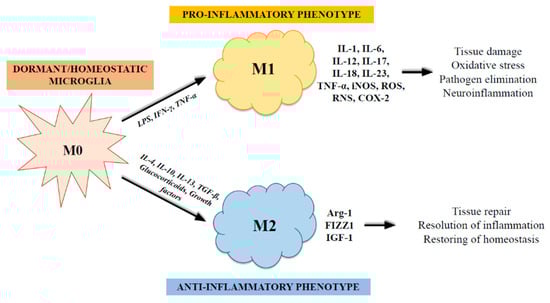 The two primary activation phenotypes of microglia. In physiological conditions, the microglia are dormant (M0). Injurious circumstances can cause the activation of resting microglia into distinct phenotypes, M1 and M2, having a proinflammatory phenotype (inducing neurological damage) and taking part in resolution of inflammation (with a neuroprotective role), respectively.