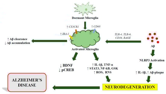 Microglia have been suggested as key participants in AD and cognitive decline may be induced at least in part by the increase of microglia, as demonstrated by overexpression of its specific biomarker IBA-1 []. IBA-1 and the fractalkine receptor CX3CR1, which is not only present in microglial cells and is also a receptor for the neuronal ligand CX3CL1, form an essential pathway for interplay between neurons and microglia []. Although every microglia expresses IBA-1, it would be desirable to employ other biomarkers to identify active cells, such as CD68 []. It would also be easier to grasp the findings if there was a biomarker that measured the quantity of activated microglia as well as overall microglia levels. Upregulation of IBA-1, biomarker for microglia [], is also coupled to an increase of interleukin (IL)-1β, signal transducer and activator of transcription 3 (STAT3), nuclear factor kappa-light chain-enhancer of activated B cells (NF-κB), tumor necrosis factor alpha (TNF-α), and glycogen synthase kinase 3 beta (GSKβ). In addition, a decrease of other molecules, such as brain-derived neurotrophic factor (BDNF) and cAMP response element-binding protein (CREB) in activated cells is observed [,,]. While IL-1β, STAT3, NF-kB, TNF-α, and GSK are linked to the activation of several pro-inflammatory pathways that would impair cognition and memory, CREB and cAMP play a critical role in cognitive performance and memory preservation [,,] (Figure 2). Accordingly, the deletion of NLRP3, the master regulator of IL-1β, significantly improves cognitive impairment in AD mouse models, in addition to lowering Aβ-induced microglial activation in vitro, Aβ-deposition, or Tau pathology. Therefore, an adequate cellular homeostasis appears to depend on fine-tuning of NLRP3 inflammasome, that was shown to be abnormally activated in AD [,,,,,].