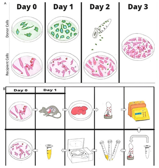 Mitochondrial Isolation: Basic protocol of mitochondrial isolation from cells (A) and tissue from mice (B). A. donor and recipient cells plated and stained with 2 distinct colors; the donor mitochondria are isolated and infused into the recipient cells. Mitochondria are isolated from mouse liver via dissociation and centrifuge. Mitochondria are infused into the cells or mice within 1 hour of isolation. Uptake can be visualized the next day because the mitochondria in the mouse liver are labeled with GFP.