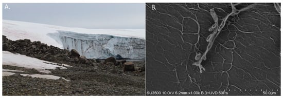 (A) Picture of the sampling place in Collins Glacier S 62°09′51″ W 58°51′00″. (B) Scanning electron micrograph of Cladosporium antarcticum.