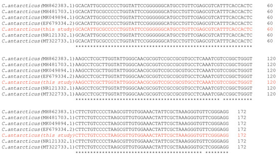 Multiple sequence alignment of the ITS region of the Cladosporium antarcticum strains, in red. The strain accession numbers are in parentheses.