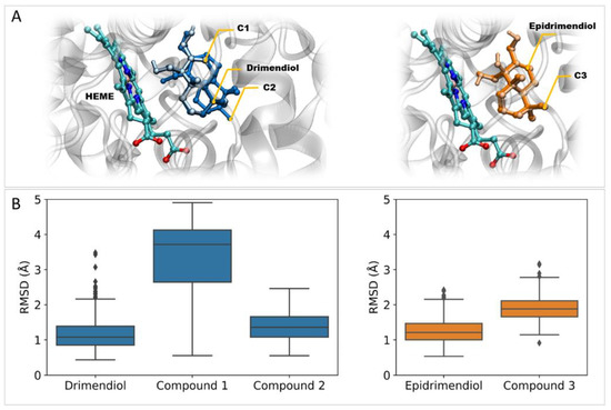 (A) Initial coordinates of the ligand–enzyme complexes obtained from molecular docking calculations. Structures correspond to the highest-ranked models for the interaction between the enzyme lanosterol 14α-demethylase and the set of ligands under study. (B) Boxplots for ligands’ RMSD (Å) as obtained from the analysis of protein-aligned MD trajectories.