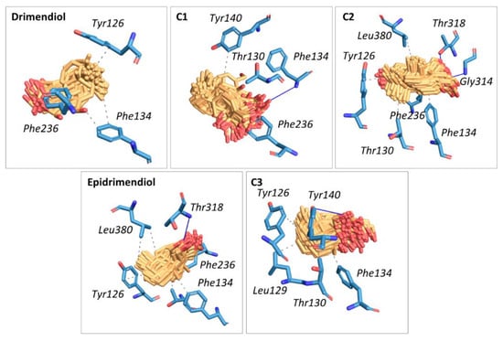 The nature of the intermolecular interactions responsible for ligand–enzyme binding was examined using the Protein–Ligand Interaction Profiler web tool [14] on 150 frames retrieved from the equilibrated MD trajectories. (Figure 4). Results indicate that the binding of a ligand is mostly mediated by hydrophobic interactions between the drimane moiety and apolar residues of the binding site. Hydrophobic interactions are mostly driven by Tyr126, Phe134 and Phe236 residues, which participate in the binding of all studied ligands. On the other hand, the residues Tyr140, Gly314 (backbone), Thr318 and Phe134 (backbone) participate in hydrogen bonds. The diversity of interactions found within the set of complexes under study suggests that slight chemical and stereochemical differences between ligands affect their binding modes to the enzyme. This could be related to differential inhibitory capacities.