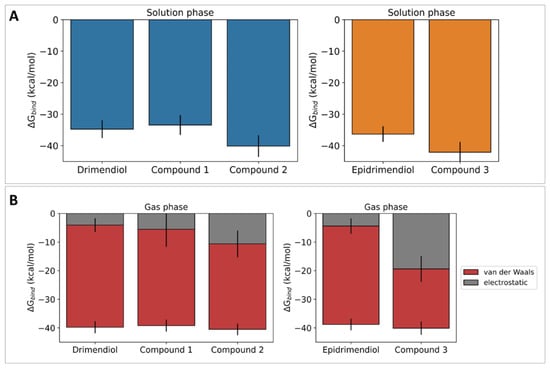 Ligand–enzyme binding free energy calculations were carried out using the MM/GBSA approach to estimate the strength of the corresponding complexes (Figure 5). According to these calculations, all ligands are capable of binding to lanosterol 14α-demethylase with similar binding free energy. Nevertheless, compounds 2 and 3 show significantly lower mean values than their parent compounds drimendiol and epidrimendiol (p < 0.05). Decomposition of the gas-phase binding free energy in van der Waals and electrostatic terms suggests that the lower binding free energy values for compounds 2 and 3 arise from larger electrostatic terms, which in turn arise from the polarity increase after the biotransformation process.