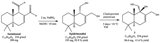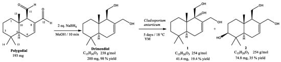 To a five-day culture (300 mL, YM media, 20 °C, under stirring) of Cladosporium antarcticum a solution of drimendiol or epidrimendiol (200 mg, 238 g/mol, 0.84 mmol) was added dropwise and dissolved in two mL of acetone, then the fungal culture was kept under growing conditions. Each day, the biotransformation process was monitored, removing five mL of the liquid culture (under sterile conditions), extracting the organic compounds with EtOAc and evaluating the starting material and new products by TLC. After five days, the biotransformation was stopped, the liquid media was extracted three times with 300 mL of EtOAc and the organic layer was pooled and dried with anhydrous MgSO4 (s), then the solvent was removed under vacuum, obtaining a crude extract, which was purified by silica gel column chromatography with hexane/EtOAc (1:1 v/v). The products were dried and kept at −20 °C.
