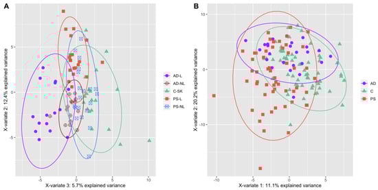(A) PLS-DA plot of the samples of AD (lesional skin—filled violet circles, non-lesional skin—empty violet circles), PS (lesional skin—filled red squares, non-lesional skin—empty blue squares) and C (filled green triangles) skin. (B) PLS-DA plot of the samples of AD (violet circles), PS (red squares) and C (green triangles) sera. Data is based on metabolites that changed statistically significantly from Kruskal–Wallis test.