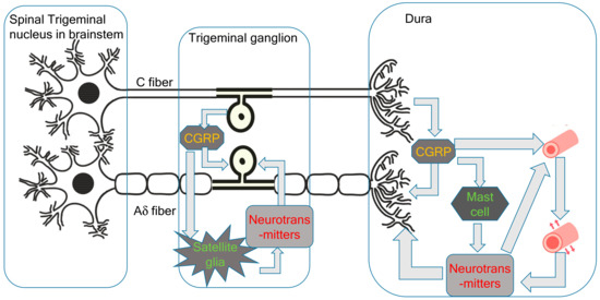 - Messlinger, K.; Russo, A.F. Current understanding of trigeminal ganglion structure and function in headache. Cephalalgia 2019, 39, 1661–1674. [Google Scholar] [CrossRef] [PubMed]
