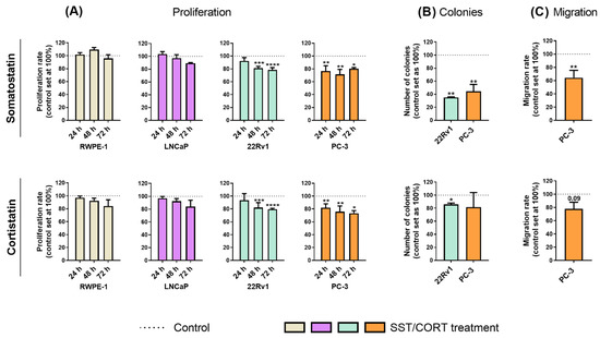 Functional effects after somatostatin (SST) and cortistatin (CORT) treatment in prostate cells. (A) Proliferation rate of normal prostate (RWPE-1) and prostate cancer (PCa) cells [androgen-dependent (LNCaP) and androgen-independent (AI; 22Rv1 and PC-3)] in response to SST and CORT treatment (after 24, 48 and 72 h). (B) Colonies formation in response to SST and CORT treatment in AI-PCa cells. (C) Migration rate of PC-3 cells after 16 h of SST and CORT treatment. Data were represented as percent of vehicle-treated cells (set at 100%). Asterisks (* p < 0.05; ** p < 0.01; *** p < 0.001; **** p < 0.0001) indicate statistically significant differences between groups.