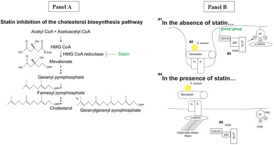 Summary of the proposed mechanism for statin inhibition of host cell invasion by Staphylococcus aureus, a leading etiologic agent in infection of cardiac and prosthetic device infections. (A): Statins inhibit 3-hydroxy-3-methyl-glutaryl-coenzyme A (HMG-CoA)-reductase at the early, rate-limiting step of the cholesterol biosynthesis pathway, decreasing cholesterol levels as well as decreasing the formation of intermediates within the cholesterol biosynthesis pathway. (B): Infection by S. aureus in the absence of statins (Step #1) proceeds through fibronectin-binding proteins expressed on the cell surface of invasive strains, engaging host fibronectin at the host alpha5/beta1 integrin receptor (#2) []. Engagement stimulates CDC42 activation [] at the host cell membrane where CDC42 is anchored via long, hydrophobic prenyl groups []. Activated CDC42 couples to membrane-localized phosphoinositide 3-kinase (PI3K), initiating cell signaling cascades that include PI3K phosphorylation of phosphoinositide 1,2-bisphosphate (#3) [], potentially dislodging alpha-actinin from actin stress fibers [] and stimulating endocytic uptake of the bacterial/fibronectin/receptor complex []. This uptake provides invasive strains with an intracellular niche for entering dormancy [,] or for active replication that leads to host cell lysis and reinfection of adjacent cells []. Infected immune cells serve as a “Trojan Horse” for the transport and establishment of secondary infection at distal sites [] such as cardiac devices and hip and knee replacements. In the presence of statins (#4) that inhibit the early, rate-limiting step of the cholesterol biosynthesis pathway [], long, hydrophobic prenyl intermediates become less abundant for membrane anchoring of CaaX-domain-containing proteins, including the small GTPase CDC42 []. Sequestration of CDC42 within the cytosol decreases access to downstream mediators, including PI3K (#5). Intracellular infection decreases in part through decreased fibronectin binding at the host cell membrane [], decreased integrin receptor complex formation [], and decreased actin reorganization [].