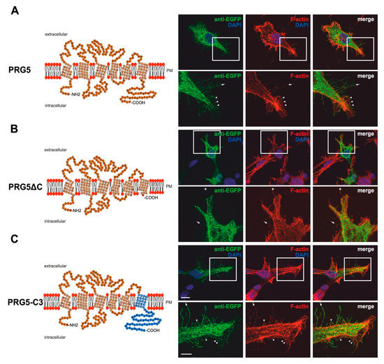 Recently, the role of two transmembrane proteins, plasticity-related gene 3 (PRG3; also referred to as lipid phosphate phosphatase-related gene 1 (LPPR1)), and plasticity-related gene 5 (PRG5/LPPR5) in neuronal differentiation has been shown [7,8,9,10]. PRG3 and PRG5 belong to the family of plasticity-related genes (PRGs), which defines a subclass of the Lipid Phosphate Phosphatase (LPP) superfamily. The PRG family comprises five, vertebrate, brain-specific membrane proteins, which influence lipid phosphate signaling and thereby promote filopodia formation, neurite extension, axonal sprouting and reorganization after lesions [7,8,9,11,12,13,14,15,16,17]. Although PRG3 and PRG5 share the highest structural and sequence similarities within the PRG family, their short (~50 amino acids) intracellularly located C-termini are unique [16,18], which indicates that they might exert different functions in cells compared to each other.