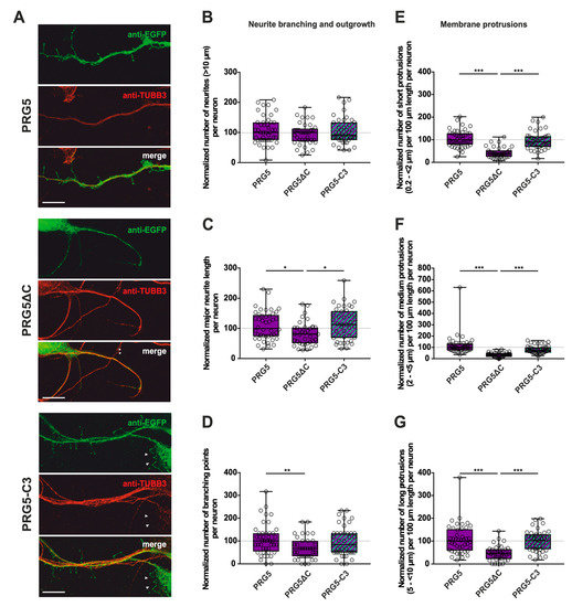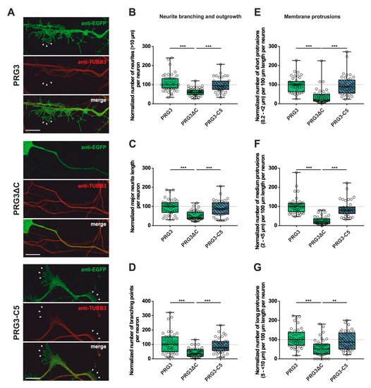 The PRG5 C-terminal domain is an important player in the early development of hippocampal neurons. Subcellular distribution of PRG5-, PRG5∆C- and PRG5-C3-encoding fusion proteins in immature, primary hippocampal neurons in culture. Hippocampal neurons in culture were transfected at DIV1 with (A) either PRG5- (upper panel), PRG5∆C- (middle panel), or PRG5-C3-encoding plasmids (lower panel), and analyzed at DIV2. Confocal stacks of representative neurons with immunocytochemistry of the respective fusion proteins stained for GFP to visualize the morphology of the cell or tubulin are shown. Arrowheads denote areas showing membrane localization. The scale bar represents 10 µm. Boxplots showing the quantification of (B) the total number of neurites; (C) the major neurite length (* p ≤ 0.01); (D) the number of branching points (** p ≤ 0.01) in PRG5-, PRG5∆C- and PRG5-C3-overexpressing neurons. Quantification of membrane protrusions in subgroups based on length in the (E) group of short protrusions (0.2–<2 µm), (F) medium protrusions (2–<5 µm) and (G) long protrusions (5–<10 µm). (PRG5 n = 44, PRG5∆C n = 37, PRG5-C3 n = 41 neurons; *** p ≤ 0.0001). All data are presented as median and IQR. Boxes range from 1st to 3rd quartile. Horizontal lines represent medians. Whiskers represent minimum and maximum. Dots represent the values of individual neurons. Statistical analysis was performed using the Kruskal–Wallis test. A level of confidence of p ≤ 0.05 was adopted (* p ≤ 0.05, ** p ≤ 0.01, *** p ≤ 0.001). PRG5 was always set to 100 and the ratios of changes of the different morphology analyses are shown (B–G).