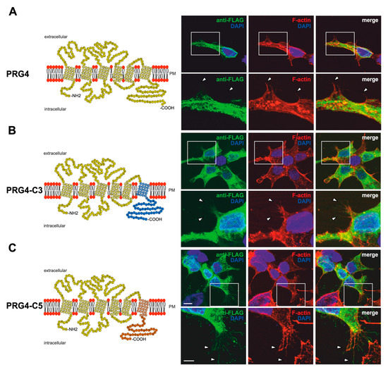 Indeed, unlike PRG3 or PRG5, the overexpression of PRG4 in non-neuronal cells led to a similar phenotype as previously described in [18], with a mainly intracellular localization of the fusion protein (FLAG-tagged) and the inability to induce the formation of membrane protrusions (Figure 5A). In contrast, PRG4-C3- and PRG4-C5-overexpressing cells clearly showed increased sheet-like structures and membrane protrusions that co-localized with F-actin structures. The intracellular distribution of PRG4-C3 and PRG4-C5 showed a punctuated pattern, similar to PRG3 and PRG5, and both were localized in the plasma membrane (Figure 5B,C).