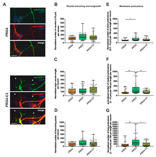 Similar to our previous analyses (Figure 3 and Figure 4), immature neurons overexpressing PRG4, PRG4-C3 and PRG4-C5 all displayed protrusions along the neurites (Figure 6, Figure 7 and Supplementary Figure S3). Despite this, when overexpressing PRG4, PRG3, or PRG4-C3, no significant differences were observed, neither in the number of neurites, nor in the major neurite length or the number of branching points (Figure 6B–D; for median/IQR see Supplementary Materials Table S3 and p values see Table 3). A considerable and significant increase was observed in all protrusions of the different subgroups of PRG3 as compared to PRG4 (Figure 6E–G; for median/IQR see Supplementary Materials Table S3 and p values see Table 3). Interestingly, the overexpression of PRG4-C3 only showed an increased tendency in the number of short protrusions, which is in-between PRG3 and PRG4, as there are neither statistical significances between PRG3 and PRG4-C3, nor between PRG4 and PRG4-C3 (Figure 6E; for median/IQR see Supplementary Materials Table S3 and p values see Table 3). Since the morphological phenotype is not the same, this points to a functional role of additional domains outside the C-terminal domain of PRG3, which are not present in PRG4.