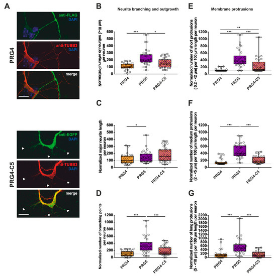 The PRG5 C-terminal domain is important in the early development of hippocampal neurons, but not sufficient to restore the full function of PRG5 when fused to PRG4. Subcellular distribution of PRG4- and PRG4-C5-encoding fusion proteins in immature primary hippocampal neurons in culture (note that the images of PRG4 are the same as in Figure 6A for better comparison). Hippocampal neurons in culture were transfected at DIV1 with (A) either PRG4- (upper panel) or PRG4-C5-encoding plasmids (lower panel) and analyzed at DIV2. Confocal stacks of representative neurons with immunocytochemistry of the respective fusion proteins stained for FLAG (green, PRG4) or GFP (green, PRG4-C5) to visualize the morphology of the cell or tubulin are shown. Arrowheads denote areas showing membrane localization. The scale bar represents 10 µm. Boxplots showing the quantification of (B) the total number of neurites (*** p ≤ 0.0001, * p ≤ 0.01); (C) the quantification of major neurite length (* p ≤ 0.01), and (D) the number of branching points (*** p ≤ 0.001) in PRG4- PRG5- and PRG4-C5-overexpressing neurons. Quantification of membrane protrusions in subgroups based on length in the (E) group of short protrusions (0.2–<2 µm) (*** p ≤ 0.0001; ** p ≤ 0.001) and of (F) medium protrusions (2–<5 µm) and (G) long protrusions (5–<10 µm) (*** p ≤ 0.0001). (PRG4 n = 30, PRG5 n = 30, PRG4-C5 n = 30 neurons). All data are presented as median and IQR. Boxes range from 1st to 3rd quartile. Horizontal lines represent medians. Whiskers represent minimum and maximum. Dots represent the values of individual neurons. Statistical analysis was performed using the Kruskal–Wallis test. A level of confidence of p ≤ 0.05 was adopted (* p ≤ 0.05, ** p ≤ 0.01, *** p ≤ 0.001). PRG4 was always set to 100 and ratios of changes of the different morphology analyses are shown (B–G).