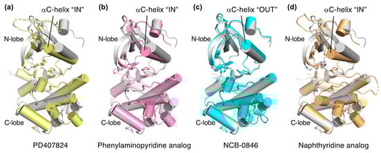 Comparison of the structures of inhibitor-bound TNIK (shown in different colors) and apo-form TNIK (gray) (PDB ID: 5CWZ) [12]. Bound inhibitors are shown as stick models. (a) PD407824 (PDB ID: 2X7F). (b) Phenylaminopyridine analog (PDB ID: 5AX9). (c) NCB-0846 (PDB ID: 5D7A). (d) Naphthyridine analog (PDB ID: 6RA5).