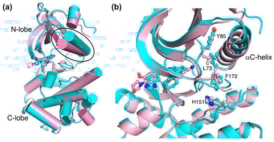 Comparison of the structures of NCB-0846-bound TNIK (cyan) (PDB ID: 5D7A) and phenylaminopyridine analog-bound TNIK (pink) (PDB ID: 5AX9). (a) Overall structure of the kinase domain. The different positions of the αC-helix are indicated by the oval. Bound inhibitors are shown in stick models. (b) Close-up view of bound inhibitors and hydrophobic R-spine residues (shown in ball-and-stick models).