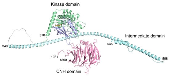 Structural model of human TNIK by AlphaFold prediction [34]. The color coding of the domains is the same as in Figure 1. The approximately 500-residue unstructured region (residues 546-1030) in the intermediate domain was omitted for clarity. Due to the unstructured regions flanking the three domains, the arrangement of each domain is expected to be flexible.
