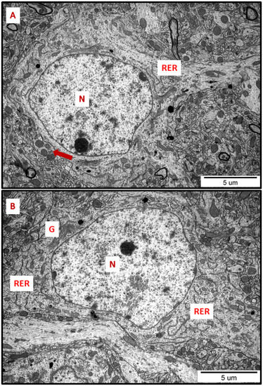 Representative TEM micrographs of cerebral (A) and hippocampal (B) sections from control animals. Normal ultrastructure of neurons is visible; RER—rough endoplasmic reticulum; N—nucleus; Golgi apparatus (G); mitochondria (arrows). Images are typical for each of the 3 examined animals per group.