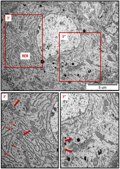 Representative TEM micrographs showing ultrastructural changes in subcellular structures of neurons in cerebral sections obtained from AgNP-treated rats. RER—rough endoplasmic reticulum; N—nucleus. Enlarged and thickened cisternae of RER (2′); swollen fragments of RER with blurred structure (arrowheads); ribosomes detached from RER lying free in the cytoplasm (thin arrows); fragmentation of mitochondria (thick arrows). Insets (2′, 2″) were magnified 2×. Images are representative for each of the 3 animals.