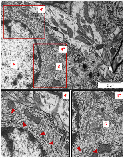 Representative TEM micrograph from brain tissue of AgNP-exposed animals showing swollen fragments of RER (arrowheads) and enlarged Golgi complex (G); N—nucleus. Insets (4′, 4″) were magnified 2×. Images typical for 3 animals per group.