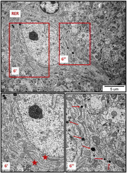 Representative TEM images from brain tissue of AgNP-exposed animals showing the ER stress in neuron. Thickened cisternae of rough endoplasmic reticulum (RER); elongated forms of mitochondria (asterisks); fragmentation of mitochondria (top of the inset 6″); lysosomes (thin arrows). The insets (6′, 6″) are magnified 2–3×. Images are representative for cerebral and hippocampal samples of each of the 3 animals.