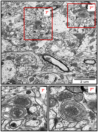 Membranous whorls were also observed. These structures are also indicative of the autophagy process, and contain remnants of disturbed organelles that represent the formation of autophagosomes (Figure 7 and Figure 8). A similar pattern of autophagy structures has been previously reported by us in AgNP-exposed adult rat brain tissue in connection with synaptic degeneration [7,18]. The profile of ultrastructural changes in neuronal RER and mitochondria was found to be generally similar regardless of the silver form administered. However, elongated mitochondria and autophagy structures were more frequently observed in AgNP-exposed rats.