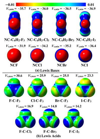 MEP maps of the utilized (a) NC-C6H2-X3 and NCX Lewis bases (LB) and (b) W-C-F3 and F-C-X3 Lewis acids (LA) molecules. The EP in these maps aligned within the −0.01 and +0.01 au range (red to blue colors). The Vs,min/Vs,max values are in kcal/mol.