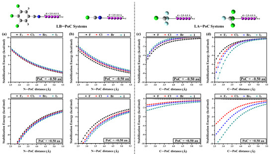 The PoC approach was utilized to investigate the Lewis basicity and acidity roles on the tetrel-based interactions from an electrostatic perspective [18,47,50,71]. Using PoC approach, the effect of N∙∙∙ and C∙∙∙PoC distances were examined for the considered the NC-C6H2-X3/NCX (LB)∙∙∙ and W-C-F3∙∙∙/F-C-X3 (LA)∙∙∙PoC systems under the effect of PoC = ±0.50 au in distance range of 2.5–5.5 Å along the x-axis with a 0.1 Å step size. The molecular stabilization energies (Estabilization) were then evaluated and given from Equation (1) [63,72,73]: