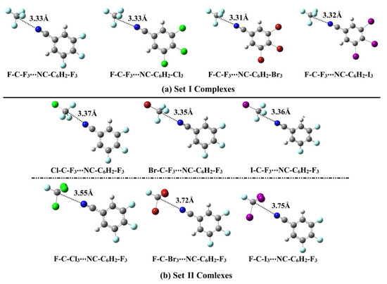 Moreover, for Set I complexes, vast Eint were clearly seen in the case of F-C-F3∙∙∙NC-C6H2-X3 complexes, i.e., more than in their F-C-F3∙∙∙NCX counterparts, which is in line with Vs,min claims that showed higher negative EP regions for the former Lewis bases. For instance, Eint were −1.21 and −1.13 kcal/mol for the F-C-F3∙∙∙NC-C6H2-Br3 and ∙∙∙NCBr complexes alongside Vs,min values of −36.5 and −5.2 kcal/mol for NC-C6H2-Br3 and NCBr Lewis bases, respectively.