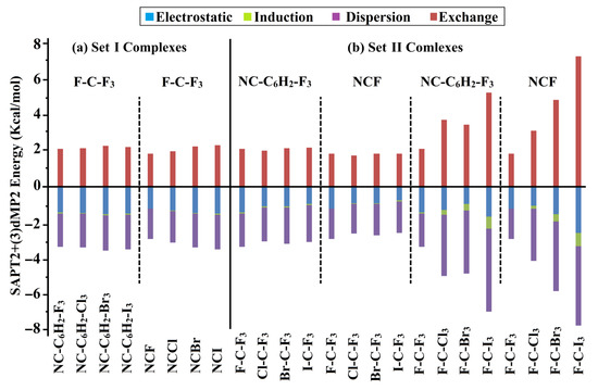 As can be seen from Figure 7, negative energetic values were denoted for the electrostatic (Eelst), induction (Eind), and dispersion energy (Edisp) forces, outlining their contributions in stabilizing all the Set I and II complexes. Apparently, the Edisp was the most dominant force within such attractive forces. On the other hand, unfavorable contributions for the exchange energy (Eexch) with positive values were also admitted. Illustratively, Eelst, Eind, Edisp, and Eexch values were −2.66, −0.78, −5.24, and 7.53 kcal/mol for F-C-I3∙∙∙NC-C6H2-F3 complex (Table S1).