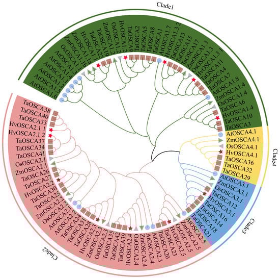 To explore the phylogenetic relationships of the OSCA family, a neighbor-joining (NJ) phylogenetic tree was constructed using the full-length protein sequences of 13 HvOSCAs, 42 TaOSCAs, 15 AtOSCAs, 11 OsOSCAs and 11 ZmOSCAs (Table S3). Results showed that these OSCA proteins were classified into four clades based on phylogenetic relationship (Figure 1), which was consistent with previous studies [,]. Further, thirteen HvOSCAs were distributed asymmetrically in each clade, with five, six, one and one members belonging to clade 1 to clade 4, respectively. In general, the HvOSCAs displayed closer phylogenetic relationships with those of wheat and rice compared to that of A. thaliana.