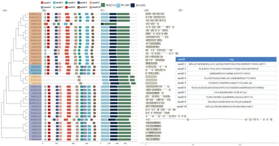 Motif composition, conserved domain and gene structure analysis of HvOSCAs. (A) Phylogenetic relationship of HvOSCAs, members of different clades were marked in different background colors. (B) Functional motif compositions of these 13 HvOSCAs. Ten motifs were represented by rectangle box in different colors. (C) The function conserved domain of PFAM02714, PFAM13967 and PFAM14703 organization in HvOSCAs, represented by dark blue, dark turquoise boxes and purplish blue, respectively. (D) Intron-exon organizations of HvOSCAs. The introns and exons are represented by the broken line and gray boxes, respectively. (E) The protein sequence of the 10 identified motifs.