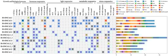 Cis-elements found in the promoter region of HvOSCAs. (Left): The number and function classification of cis-acting element in each HvOSCA genes. (Right): Distribution of 37 identified cis-acting elements in each HvOSCA; elements are represented by the boxes in different colors.