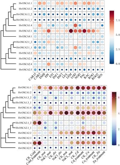 To get more information about the function and molecular modules of HvOSCAs that are involved in the response to abiotic stresses, the WGCNA method was employed to analyze the co-expression network based on the RNA-seq data under diverse stresses, and the HvOSCAs associated modules were identified. The present study results showed that a total of 27,987 genes displayed significant expressions, and these were used for constructing co-expression networks. A total of 47 co-expression modules with the gene number ranging from 34 to 7981 were obtained (Figures S2 and S3, Table S9). Then, the modules that 13 HvOSCAs were involved were further identified. Results found that 12 out 13 HvOSCAs were inv olved in 7 co-expression modules, including cyan, brown, blue, turquoise, green, pink and red modules. It is interesting that these 12 HvOSCAs had the conserved RSN1_7TM functional domain that is the most prominent characteristic of calcium-permeable stress-gated channel proteins, while the remaining HvOSCA2.3 without the RSN1_7TM domain was not found in these constructed modules. Furthermore, a correlation analysis of these seven modules with the stress treatments was performed (Figure S4). Interestingly, one, one, four, one, two, one and one HvOSCAs were found in the cyan, brown, blue, turquoise, green, pink and red, respectively. The red module was significantly correlated with cadmium treatment and the turquoise module was correlated with cadmium treatment and copper treatment, respectively. The green module was correlated with NaCl treatment of the mature zone of the root, and also correlated with copper treatment. The brown module was significantly correlated with NaCl treatment of the elongation zone. The cyan and pink modules were both correlated with NaCl treatment of the mature zone. The results suggest the function of HvOSCAs in the heavy metal ion and salt response.
