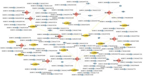 miRNA¬–mRNA interaction network of HvOSCAs involving responses to abiotic stresses. The HvOSCAs are represented by the red diamonds, the predicted miRNAs by yellow ovals and the other interacting genes by blue dots.