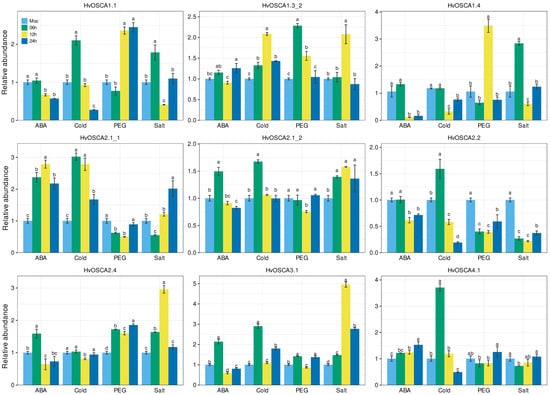Validation of the expression signature of nine HvOSCA genes under ABA (100 µM ABA), cold (4 °C), drought (20% PEG-6000) and salt (NaCl) treatment through the qRT-PCR method. The treatments were conducted with 100 µM ABA solution for ABA, 4 °C for cold, 20% PEG 6000 solution for drought, and 150 mM NaCl solution for salt stresses, respectively. Data represent the average of three technical replications and the error bar represents the standard error of mean (SEM).