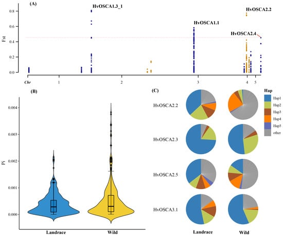 Genetic variations and haplotype analysis of HvOSCAs based on resequencing data. (A) Genetic divergence and artificial selection analysis of HvOSCAs; (B) nucleotide diversity of HvOSCA genes in landrace and wild barley populations; (C) haplotype frequency analysis of HvOSCAs in landrace and wild barley populations.