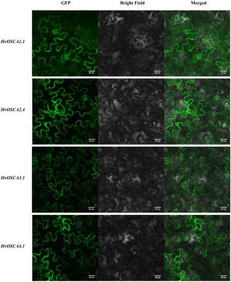 One HvOSCA member from each clade based on phylogenetic relationships (HvOSCA1.1, HvOSCA 2.4, HvOSCA3.1 and HvOSCA4.1) was randomly selected for amplification using the primers listed in Table S11. The PCR products were separately recovered and cloned into the multiple cloning sites of NdeI and SacI in the pBI121-GFP vector. Each recombinant vector was separately transformed into Agrobacterium tumefaciens strain GV3101 prepared for agro-infiltration. For transient expression of HvOSCAs in tobacco, the Agrobacterium strains harboring the recombined vector were injected into 4-week-old tobacco leaves. Then, the images of the leaves were captured after 48 h of agro-infiltration by a laser confocal microscope (Olympus, Tokyo, Japan).