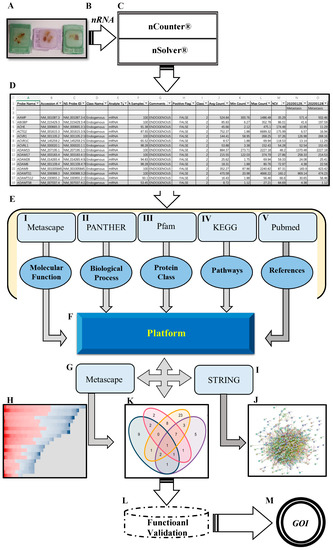 Schematic overview of the workflow. (A) FFPE tissue from PCa BM patients. (B) High quantity and quality of mRNA extracted from FFPE. (C) Fully-automated gene expression assay utilizing nCounter™ digital analyzer followed by nSolver™ NanoString technology v4.0. (D) Data output obtained from nSolver™ analyzer software. (E) Manual annotation and data enrichment procedure of DEGs: (I) Metascape for molecular function enrichment (metascape.org), (II) PANTHER for biological processes enrichment (pantherdb.org), (III) protein family using Pfam database (pfam.xfam.org), (IV) pathway enrichment retrieved from KEGG (genome.jp/keg), and (V) extracting publication for each gene by using related keywords (pubmed.ncbi.nlm.nih.gov). (F) The MACNP stands for Manually Annotated and Curated Nanostring-data Platform for 116 DEGs (PCa BM vs. primary PCa). (G,H) Further enrichment and clustering DEGs based on the interaction between MACNP platform and Metascape. (I,J) Protein–protein interaction (PPI) of DEGs analysis produced by String (string-db.org) and Cytoscape (Cytoscape.org). (K) Venn diagram representing overlapping genes obtained from the interaction between MACNP platform and bioinformatics.psb.ugent.be/webtools. (L,M) Further research schedule.