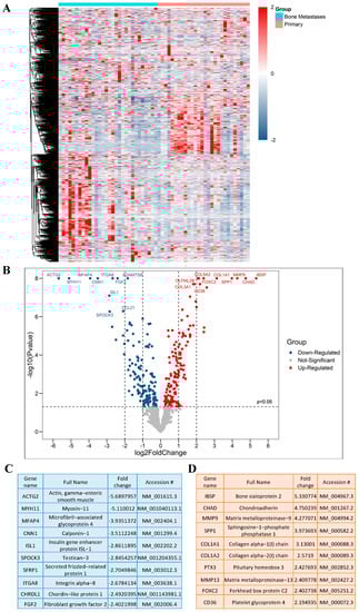 A schematic overview of the experimental study design is provided in (Figure 1). By comparing the RNA expression level of 770 genes in our samples, we found a total of 116 genes with significantly different expression in PCa BM compared to localized primary tumors. All DEGs are listed and annotated according to the literature and bioinformatic platforms, as described above, regarding PCa and BM (MACNP, Supplementary Table S1). Gene clustering according to the tissue type reveals both gene subsets to be specifically up-regulated in BM or primaries as well as subgroups within the BM and primary tumors characterized by marked up- or down-regulated gene sets (Figure 2A). Genes with the highest fold change and most significant p-value between BM and primary tumors include CD36, FOXC2, COL1A2, CHAD, SPP1, COL1A1, MMP9, IBSP, PTX3, and MMP13 which are more highly expressed in BM, and ACTG2, MYH11, MFAP4, ITGA8, CNN1, FGF2, ISL1, SFRP1, SPOCK3 and CHRDL1, which have a lower expression in BM (Figure 2B). The top 10 genes with the highest fold change are listed in (Figure 2C) (genes that are lower expressed in BM) and (Figure 2D) (genes that are higher expressed in BM).