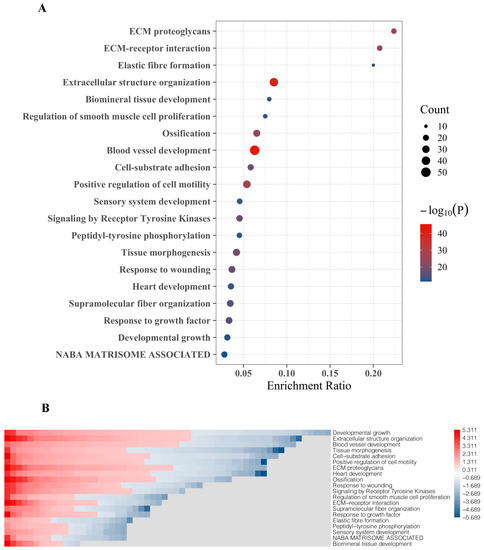 The top 20 DEGs were assigned to molecular functions using Metascape. The strongest association of these genes was found to include extracellular matrix (ECM) proteoglycans, ECM-receptor interaction, and elastic fiber formation (Figure 3A). DEG with the highest fold change and significance are functionally associated with extracellular structure organization and blood vessel development, which also include most genes (gene count, reflected by bubble size) (Figure 3A). Other BM-related features which were linked to DEG include regulation of smooth muscle cell proliferation, ossification, cell-substrate adhesion, positive regulation cell motility, receptor tyrosine kinase signaling, response to wounding, fiber organization, and response to growth factors (Figure 3A). Gene enrichment analyses designating certain functional features included the top 20 DEG showing both up-regulation and down-regulation in BM compared to primary tumors (Figure 3B).
