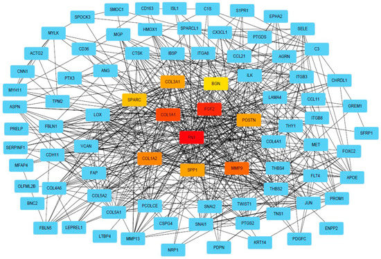 PPI network of DEGs. PPI network of DEGs analysis provided by String (string-db.org) and Cytoscape (Cytoscape.org), squares indicate DEGs, and lines indicate interactions. The intensity in red of the squares indicates the degree of global network interactions.