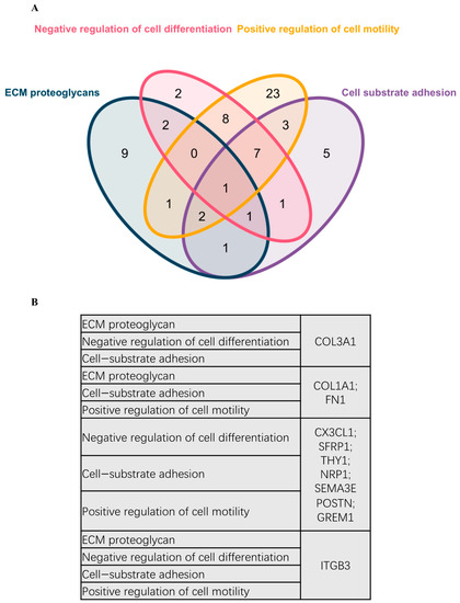 DEG was further used for PPI analysis using String. We found a high degree of interactions between up- and down-regulated genes with FN1, MMP9, COL1A1, COL1A2, and FGF2 showing the highest degree of global network interactions. In addition, several DEG showed overlapping molecular functions, revealing that cell motility includes the highest number of overlapping DEG followed by cell adhesion and ECM proteoglycans (Figure 4). Eight DEG have overlapping functions referring to the regulation of cell motility and cell differentiation, while seven genes have overlapping functions referring to the regulation of cell motility, cell differentiation, and cell adhesion (Figure 5A). COL3A1, COL1A1, FN1, CX3CL1, SFRP1, THY1, NRP1, SEMA3E, POSTN, GREM1, and ITGB3 are associated with multiple metastasis-related features (Figure 5B). ITGB3 can be functionally linked to ECM proteoglycans, cell differentiation, adhesion, and cell motility which are key features during metastasis (Figure 5B).