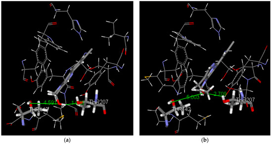 Hydrogen bond interaction of compound 18 (a) and of compound 19 (b) in the last frame of the dynamic simulation.