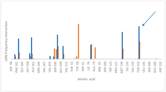 Frequency contacts of Van der Waals interaction measured during the dynamic simulation of the ligand–receptor complex; compound 18 (agonist), blue column, compound 19 (antagonist), orange column.