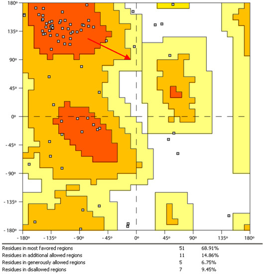 The molecular dynamic simulation of the protein–ligand complex was realized on a portion of protein identified by amino acids located at a distance < 2.0 nM from the center of the ‘benzodiazepine binding site’. During the simulation, the selected fragment did not show excessive distortion, as evidenced by Ramachandran’s plot [12] (Figure 5), which is relative to the complex conformation at the end of the 60 ns of simulation: only 9% of amino acid residues are located in a disallowed region (white).