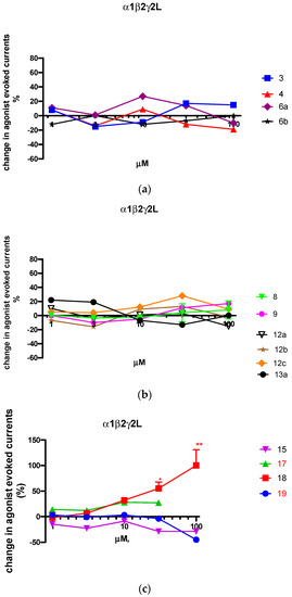 In order to verify whether the information coming from this virtual model is valid and, at the same time, to complete the study on this series, as the next step of our research, we evaluated the profile of the new compounds through electrophysiological techniques on recombinant α1β2γ2L-GABAA receptors expressed in Xenopus laevis oocytes, and the effects of compounds (1-100 µM) on the modulation of GABAA receptor function were assessed (see Figure 6). The two sections of this figure, respectively, report the experiments performed on 3-esterderivatives 3, 4, 6a, b, 8, 9, 12a–c, 13a (Figure 6a,b) and on 3-hydroxymethyl and 3-methoxymethyl derivatives 15, 17–19 (Figure 6c).
